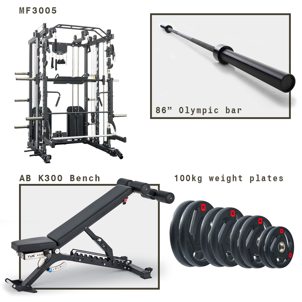 上方具有引體向上把手可做引體向上,搭配史密斯可進行深蹲、臥推、硬舉、分腿蹲,坐姿肩推、屈體划船,地雷管搭配奧槓可進行分腿蹲、雙臂划船以及地雷管肩推,史密斯槓可架上腿推板可進行倒蹬腿推,滑輪飛鳥訓練〔框架前方滑輪〕:上下拉,上下斜、夾胸、轉體、二頭彎舉、三頭下壓、側平舉、腿後踢,MF3005具有獨立高低拉系統〔框內長臂滑輪〕,可進行滑輪下拉、坐姿划船、三頭下壓、前平舉…,鋼鐵手臂進行坐姿胸推、站姿肩推、單臂划船…等