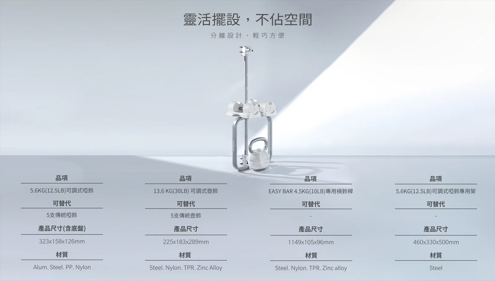 KG: 1.1、2.2、3.4、4.5、5.6kg - 3 種可調式重量器材一次滿足訓練所需,五段重量秒速調整,居家健身新未來