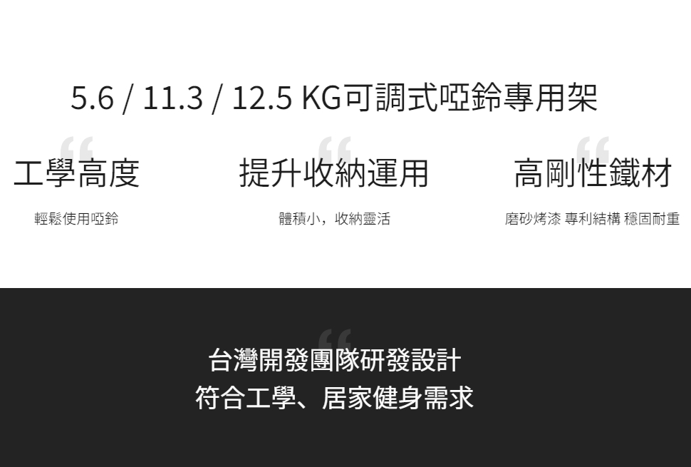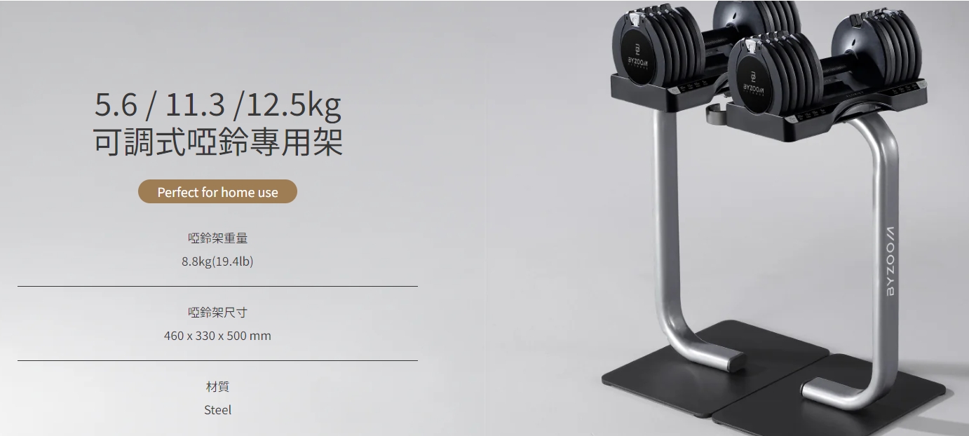 - 搭配5.6kg(12.5LB) / 11.3kg(25LB)/12.5kg(27.5LB) 可調式啞鈴