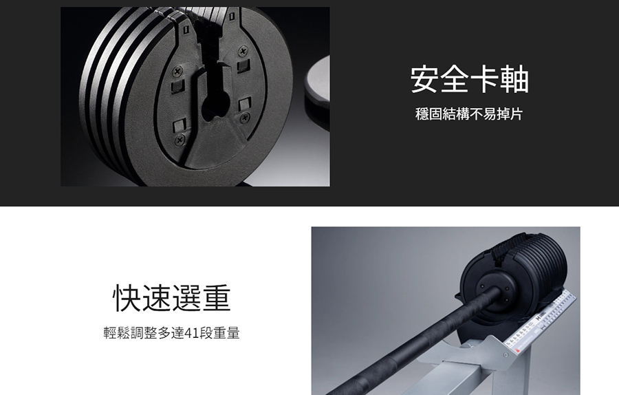 - 34kg(75lb)啞鈴重量級距,共21段重量秒速調整
